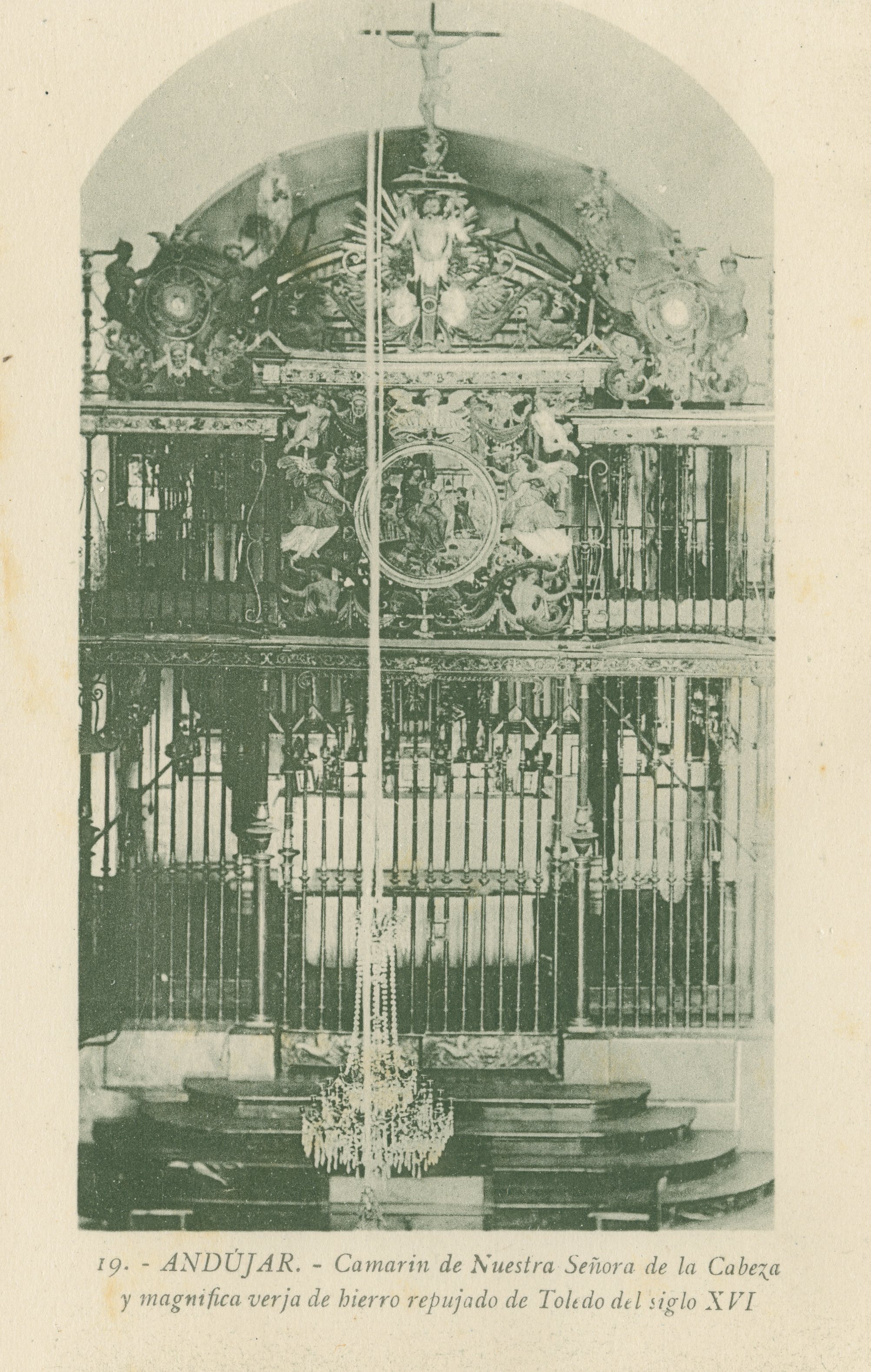 Andújar [ Material gráfico] : Camarín de Nuestra Señora de la Cabeza y magnífica verja de hierro repujado de Toledo del siglo XVI.