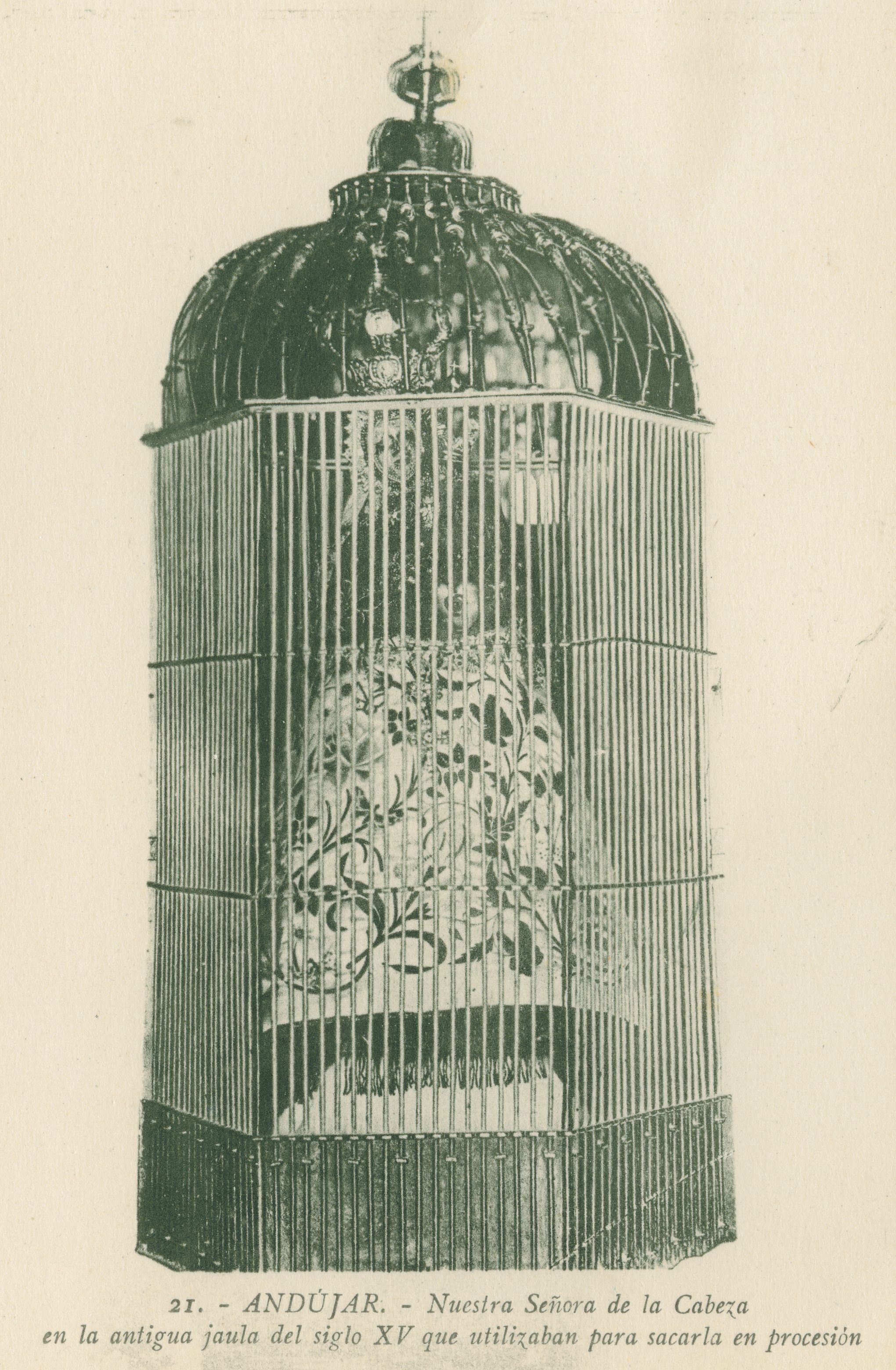 Andújar [ Material gráfico] : Nuestra señora de la Cabeza en la antigua jaula del siglo XV que utilizaban para sacarla en procesión.
