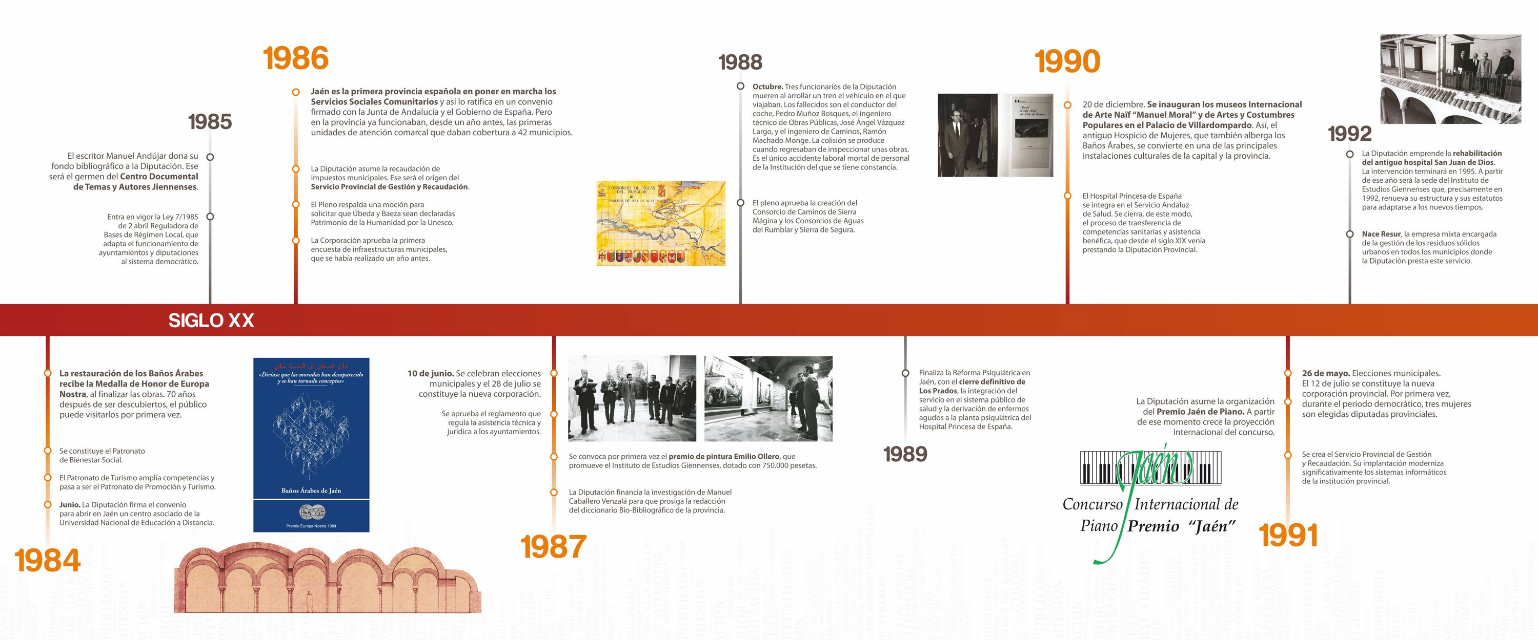 - 1986: Jaén es la primera provincia española en poner en marcha los Servicios Sociales Comunitarios. Diputación asume la recaudación de impuestos municipales, origen del Servicio Provincial de Gestión y Recaudación.