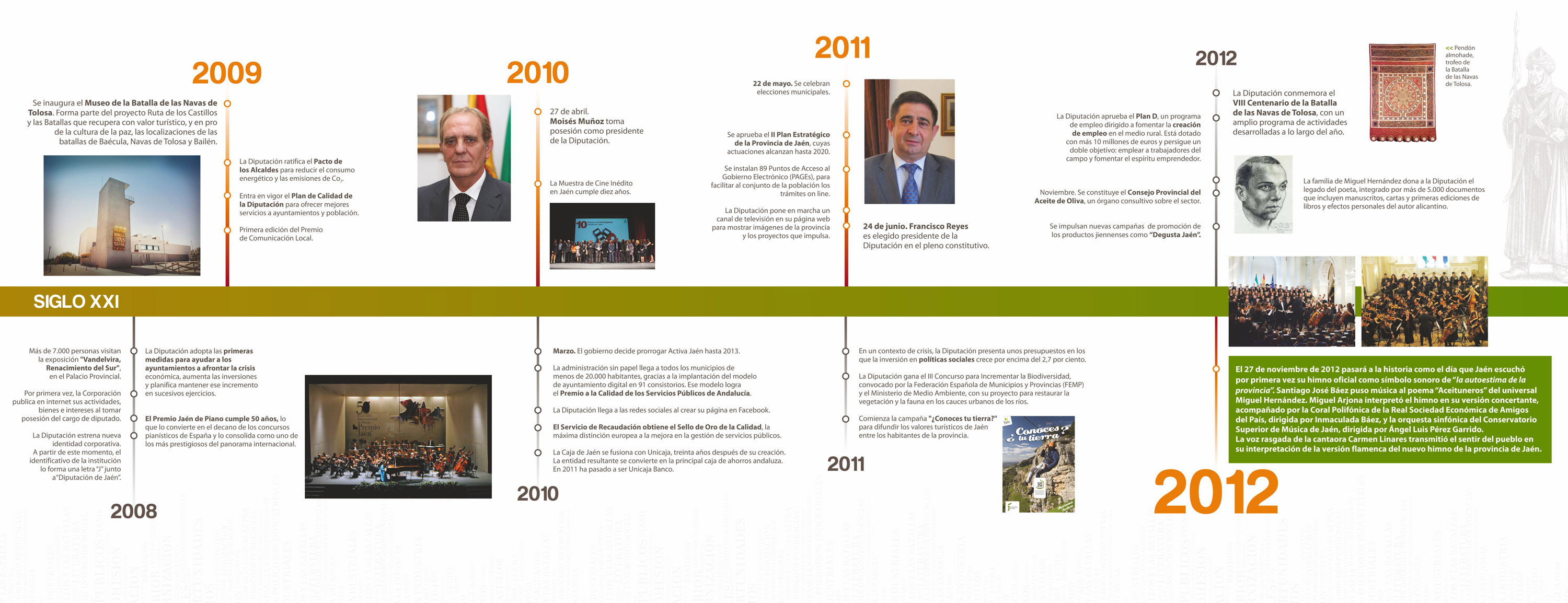 - 2012: Diputación conmemora el VIII Centenario de la Batalla de las Navas de Tolosa. Diputación aprueba un Plan de Empleo dotado con más de 10 millones de euros. Se constituye el Consejo Provincial del Aceite de Oliva. La familia de Miguel Hernández dona a la Diputación el legado del poeta. Se crea el Himno de la Provincia de Jaén.